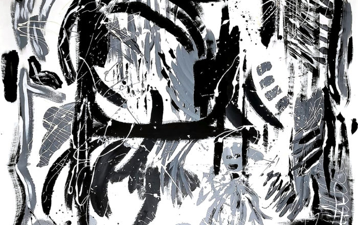 Toile libre de 240 cm de haut environ x 217 cm de large dans les tonalités de noir, blanc, gris La gestuelle amène de la vie dans ces tonalités neutres. Réalisée en 2021