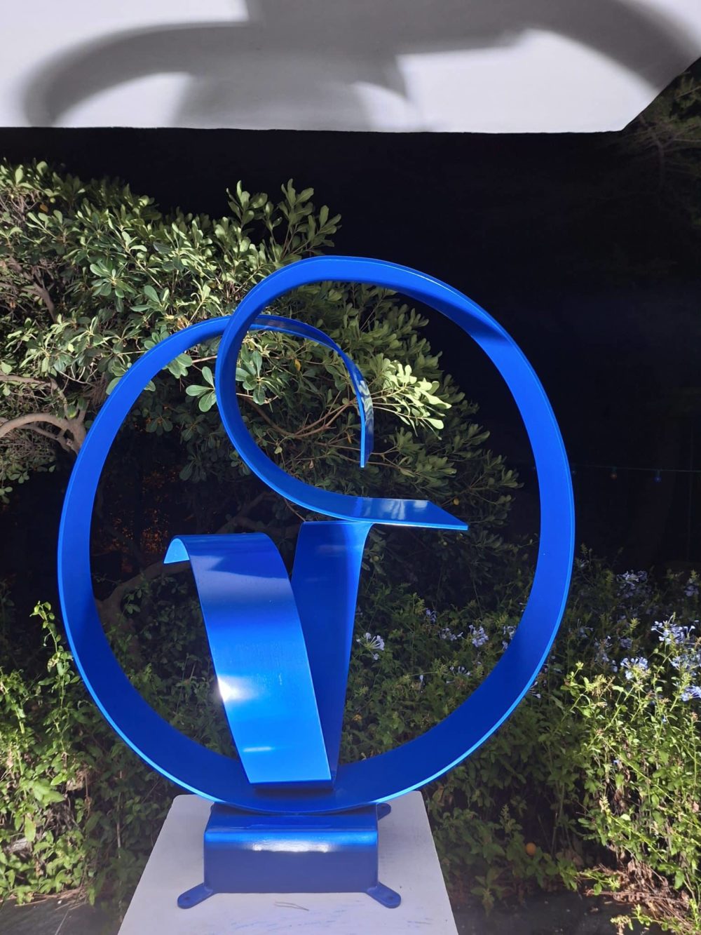 Sculpture en acier thermo laqué bleu intense. C’est une Oeuvre qui explore la rencontre entre la force et la délicatesse. C’est le langage de l’Amour qui prend soin. VENDUE